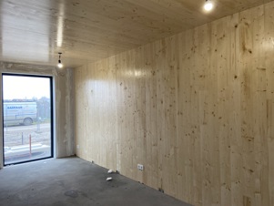 We gebruiken niet alleen hout voor de buitenzijde, maar ook binnen in de woningen: de dragende binnenwanden (de wanden met de buren) en de vloeren zijn van massief hout. Ook de dunnere binnenwanden bestaan uit een houten frame, afgewerkt met gipsplaten.