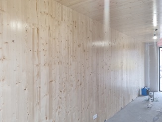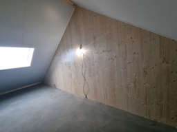 Let op: de volgende foto's zijn gemaakt tijdens de bouw. Ze zijn bedoeld om een indruk te geven van hoe de houten wanden en plafonds eruit zien in de woning. De woningen worden nog verder afgewerkt.