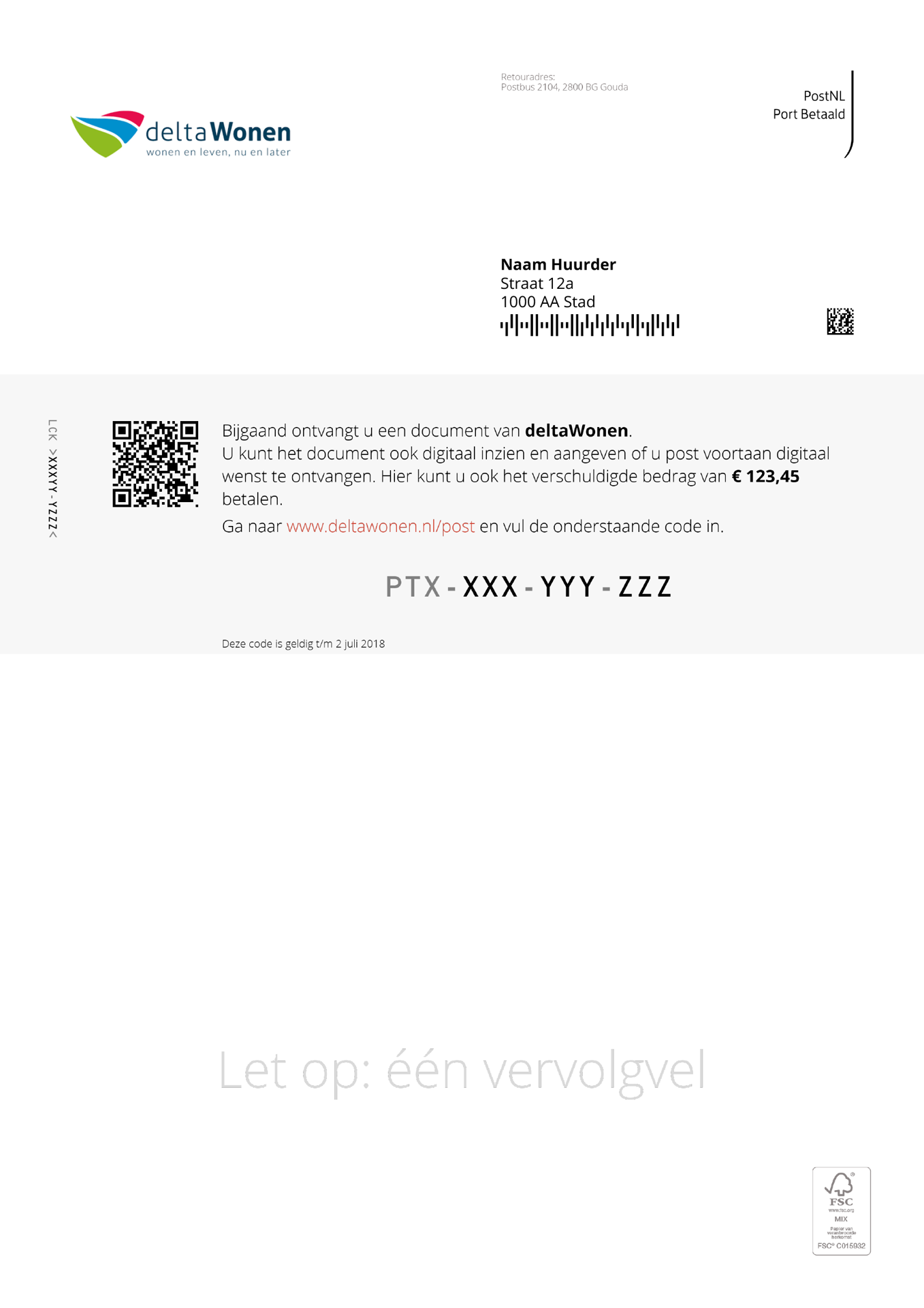 Sommige post die u van ons ontvangt, krijgt u in een andere vorm dan u gewend bent. Het gaat dan om uw huurnota of een aanmaning. Deze post verzorgt Postex voor deltaWonen.