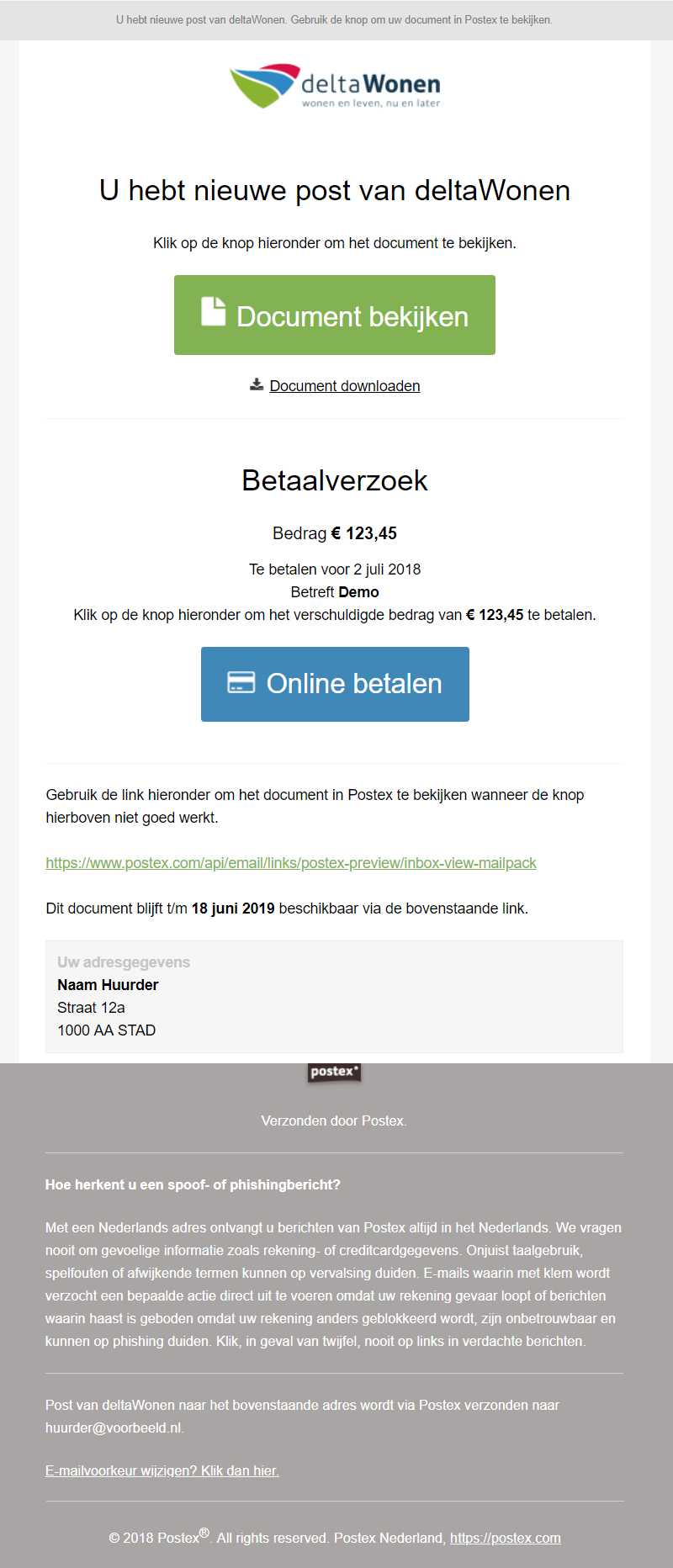 Wanneer u de post van deltaWonen digitaal ontvangt, krijgt u deze mail van Postex om u er op te wijzen dat er post is.