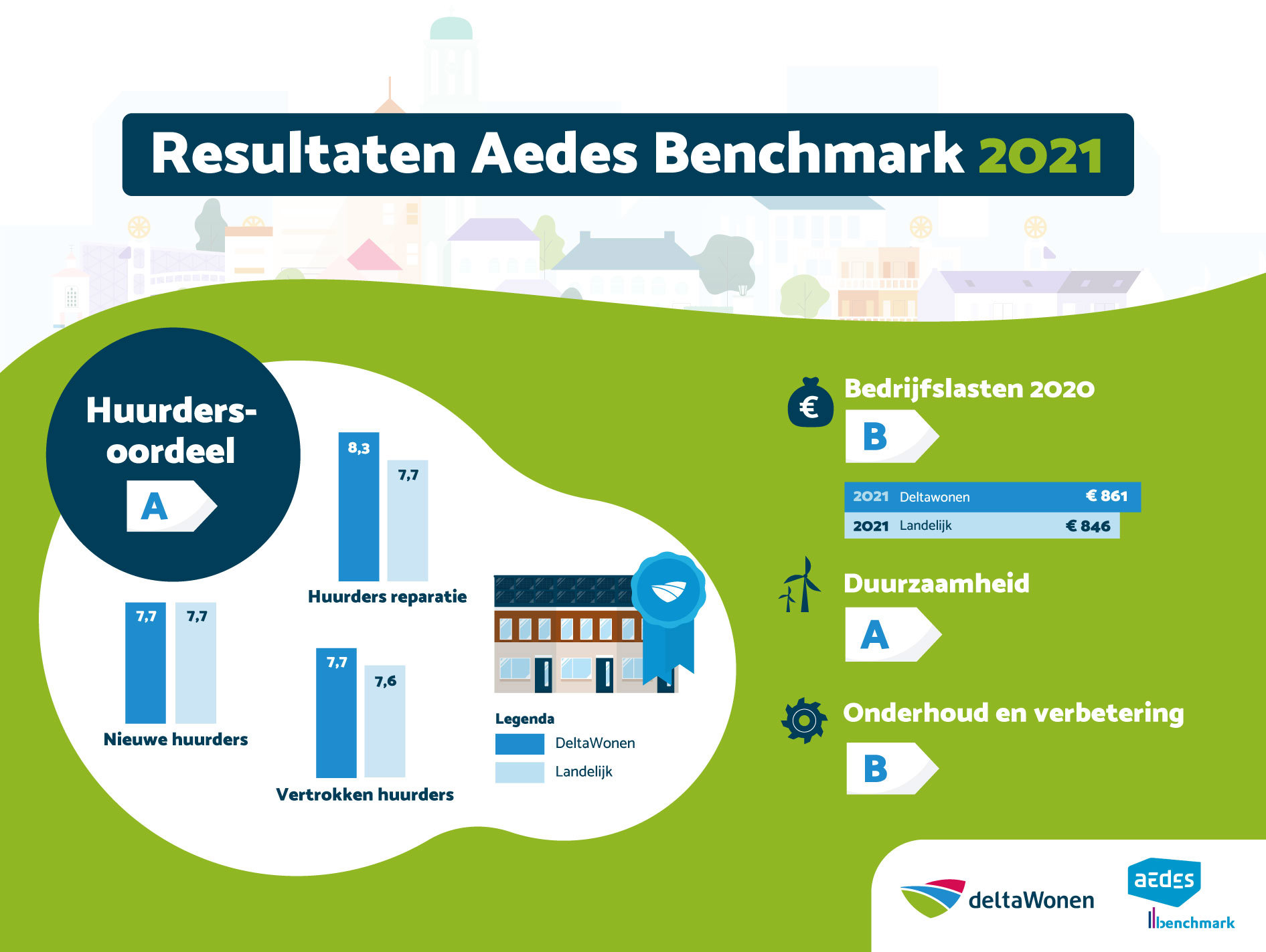 Op donderdag 18 november werden de resultaten bekend gemaakt van de Aedes Benchmark 2021. In deze benchmark worden jaarlijks de prestaties van woningcorporaties landelijk met elkaar vergeleken. En deltaWonen scoort dit jaar opnieuw goed. We behaalden dit jaar 2 x een A status (op de onderdelen huurdersoordeel en duurzaamheid) en 2 x een B status (bedrijfslasten en onderhoud & verbetering). Dit zijn scores waar we blij mee zijn!