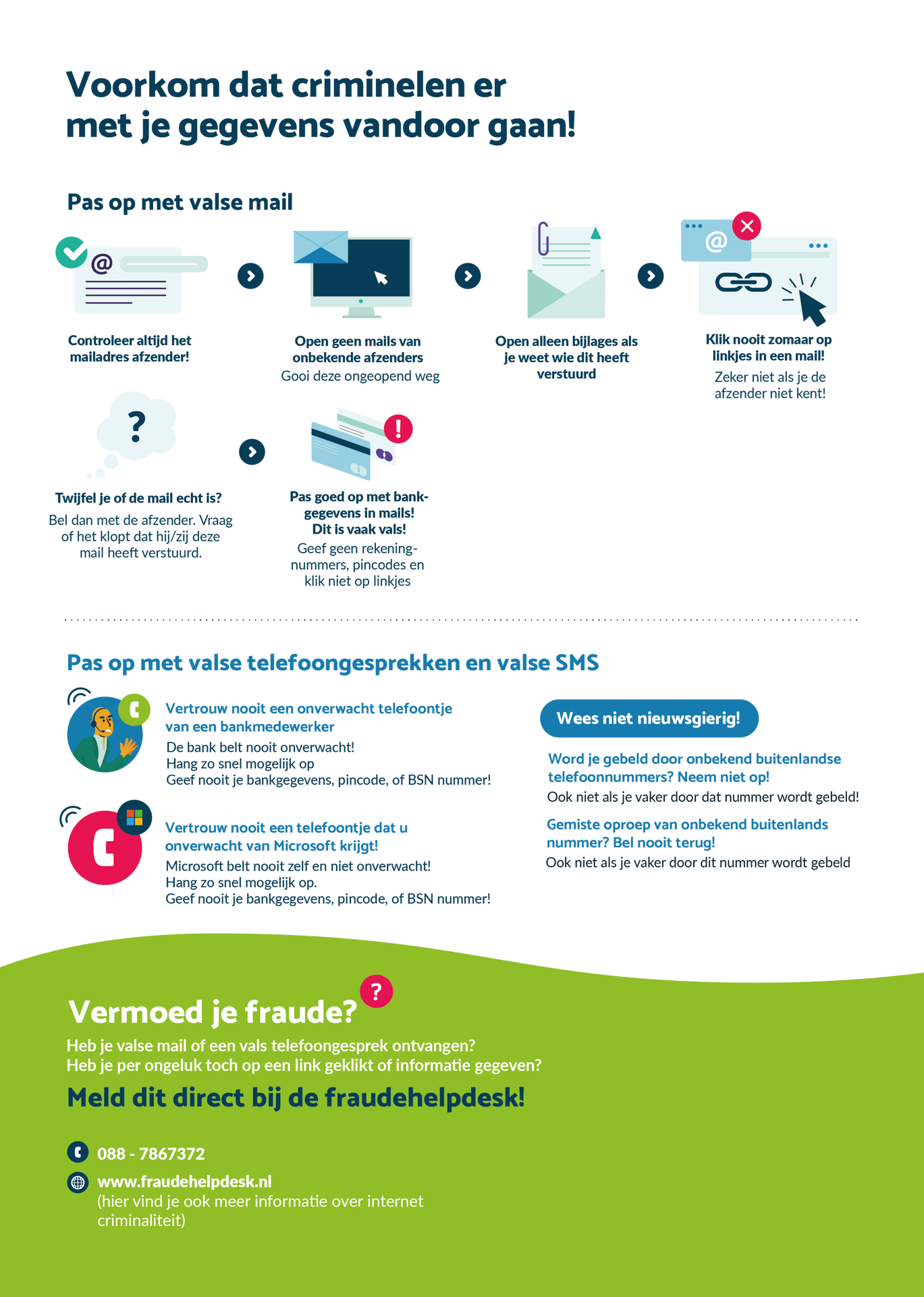 Het onderzoek toont niet aan dat uw gegevens ingezien of gestolen zijn. Maar voor de zekerheid vragen wij u om goed op te letten! Het kan zijn dat daders gaan proberen om meer persoonlijke gegevens van u te verkrijgen, zoals wachtwoorden of pincodes. Bijvoorbeeld door valse e-mails of per sms-berichten aan u te versturen. Of door valse telefoongesprekken met u te voeren. Let altijd goed op of het emailadres van de afzender klopt. En of u het telefoonnummer kent.
